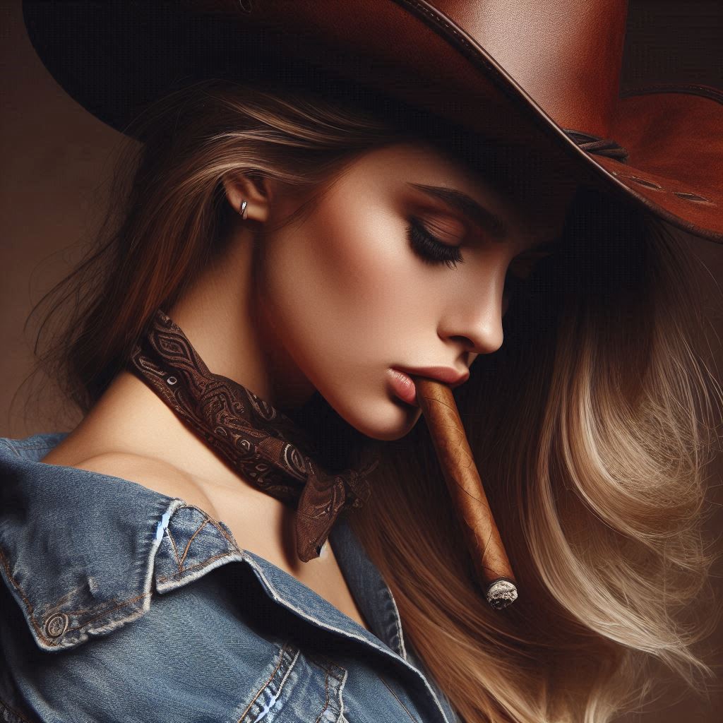 Cowgirl looking down while smoking long cigar.